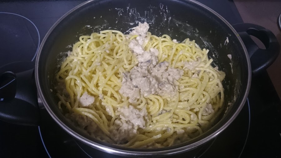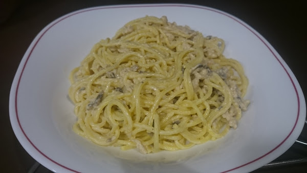 cuando ya esté lo sacamos del fuego, cogeremos los espaguetis que teníamos escurriendo y los pondremos en una cazuela, ahora juntaremos la salsa con los espaguetis y ponemos al fuego medio durante 3 min. aprox. para que se mezcle todo, una vez mezclado todo procedemos a servir, y ya tendremos nuestros espaguetis a la carbonara (es una receta personalizada no es la auténtica), espero que os guste, buen provecho