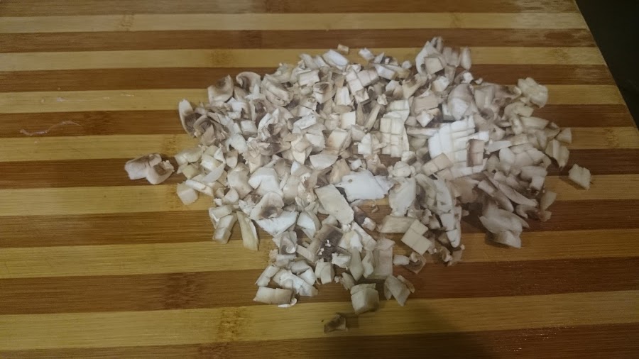 ahora cogeremos los champiñones, los lavamos y cortamos en trocitos pequeñitos y los reservamos,