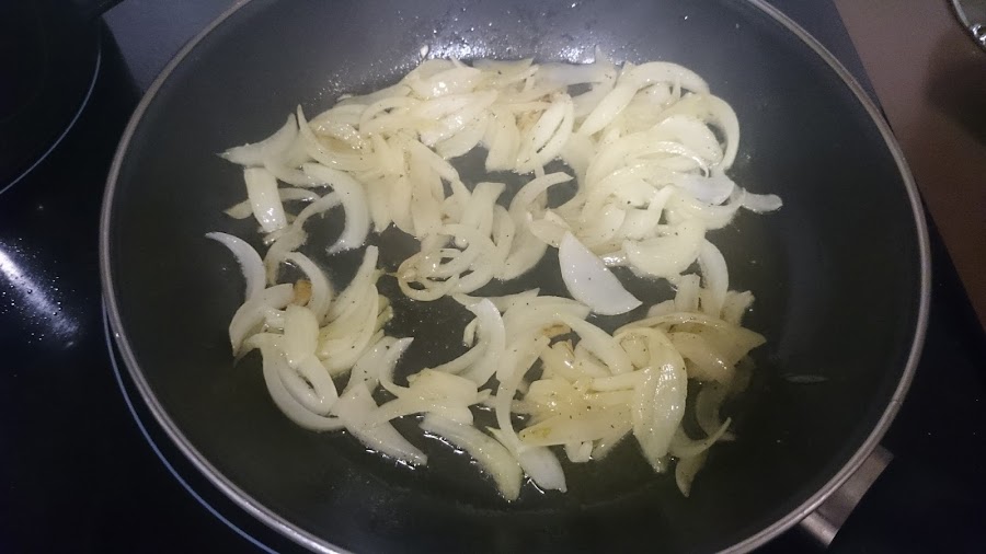 A continuación cogeremos la cebolla, la pelamos, lavamos y procedemos a cortarla o en medias lunas, cogeremos una sartén le pondremos un chorrito de aceite y la ponemos a fuego medio, cuando esté caliente el aceite echaremos la cebolla y sazonaremos al gusto,