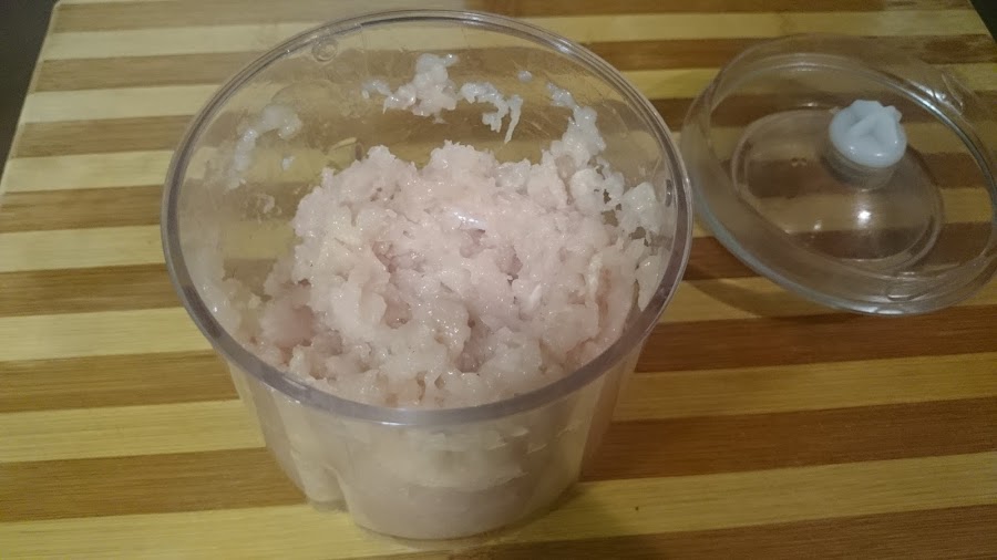 ahora cogeremos la carne picada, sino tenemos y ponemos como he puesto yo pechugas de pollo picadas, pues procederemos a picarla,