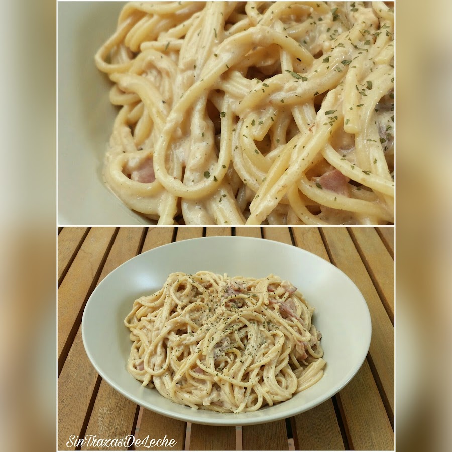 Troceamos el bacon y la cebolla,lo ponemos en una sartén con aceite hasta que esté doradito, añadimos la nata (crema de leche) de almendras, sal al gusto, pimienta, un poco de ajo en polvo y removemos todo bien.