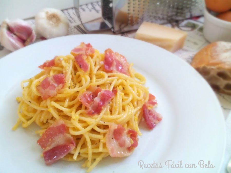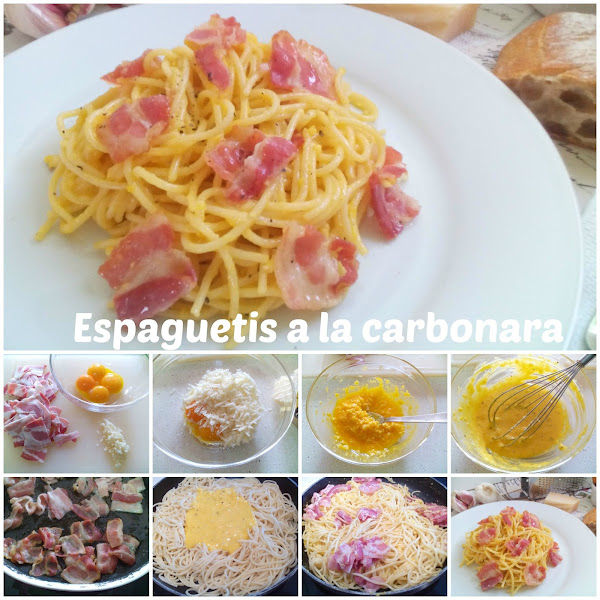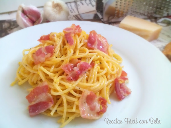 La carbonara es un plato de pasta italiano que se hace con huevos, queso parmesano, aceite de oliva, panceta o beicon y pimienta negra.