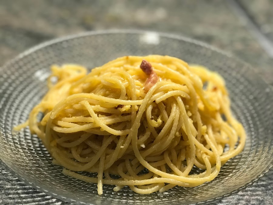 Una vez cocida la pasta, a mi me gusta al dente, la escurrimos y mezclamos bien con el bacon, añadimos la yema de huevo y el parmesano y removemos bien, fuera del fuego, para que se integre todo y lo tenemos preparado para disfrutar.