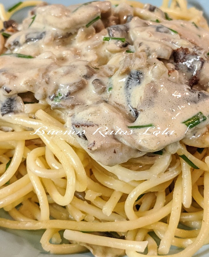 Pon los espaguetis en el plato y corona con 4 cucharadas de crema con champiñones