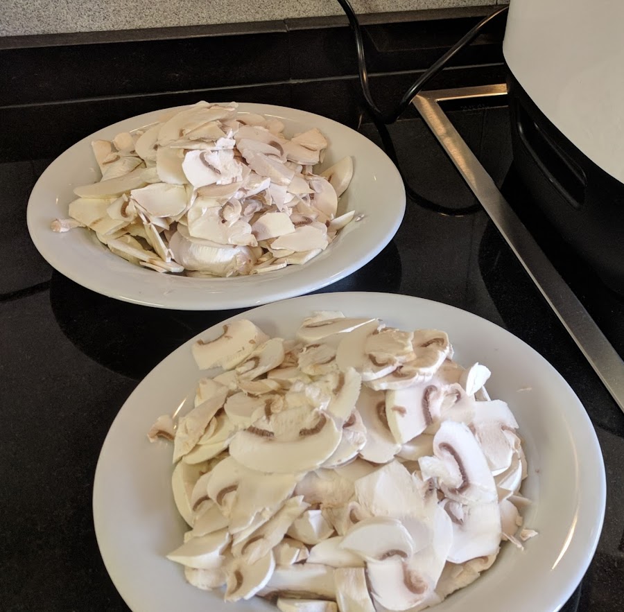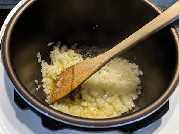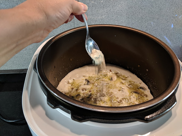 Molinillo de pimienta negraCortamos la cebolla y/o los puerros en trocitos pequeños. Ponemos en la cubeta con un chorro de aove, menú freir. Dejamos que se sofria y mientras laminamos los champiñones