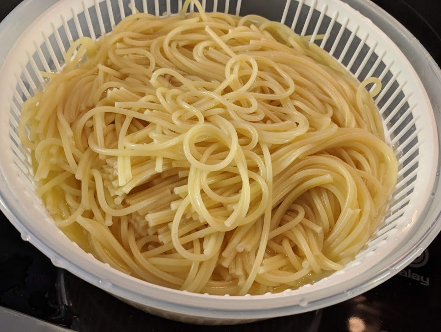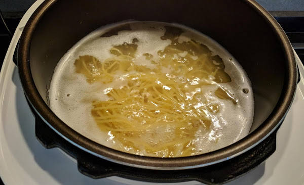 Es el momento de cocer la pasta en una cazuela con abundante agua y sal. Puedes hacerlo en la olla: menú freir y abierta. Mantén la pasta hasta que esté hecha a tu gusto y saca la cubeta sin quemarte y escurre muy bien