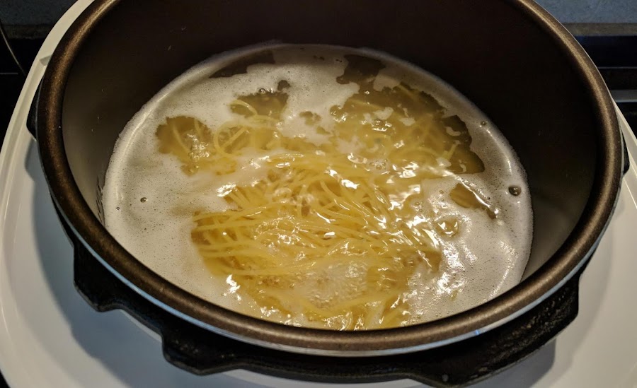 La pasta puedes cocerla en menú guiso a máxima temperatura, y sin cerrar la olla. Cuando rompa a hervir puedes bajar algo la temperatura. El tiempo lo decides tú, en función de los gustos de tu familia