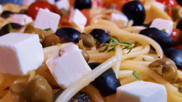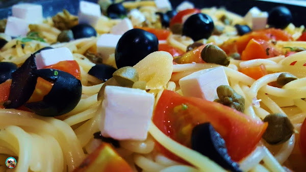 Creo que ya sabes que vas a comer hoy; un exquisito plato de espaguetis a la griega, con todo el sabor de la huerta mediterránea.