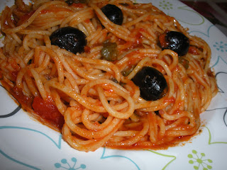 Antes de que empiecen a dorarse, le añadimos las anchoas y las alcaparras picadas y las aceitunas. Removemos un par de minutos y le añadimos la salsa de tomate que tendríamos ya preparada de antes y un pellizco de orégano. Dejamos unos 10 minutos a fuego lento.