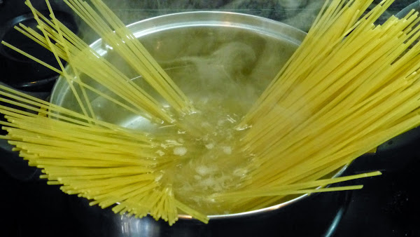 Mientras se hace la salsa coceremos los espaguetis en abundante agua hirviendo a la que añadimos un puñadito de sal.