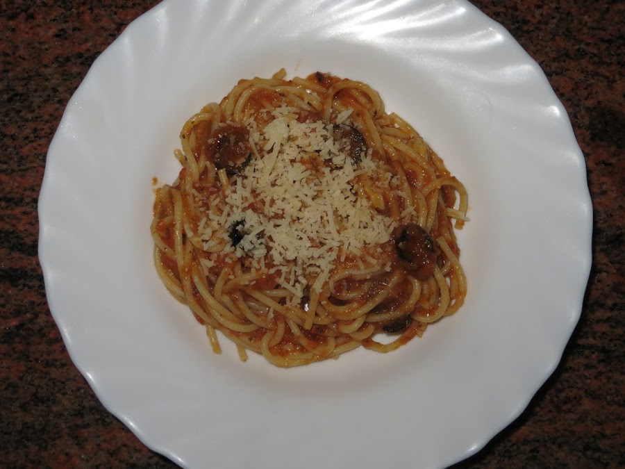Cuando veamos que la salsa tiene la textura adecuada añadimos las aceitunas cortadas en trozos y las alcaparras (no tenía en casa y no se las añadí, pero la receta original las lleva). Le damos un par de vueltas más y lo sacamos a un plato le añadimos queso rallado por encima, mejor si es parmesano y listo para comer.