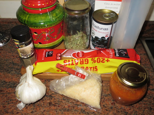 Mientras comenzamos a realizar la salsa. Echamos un chorro de aceite en la sartén echamos la guindilla y picamos el ajo cuando veamos que comienza a dorarse añadimos las anchoas y las espachurramos para que se nos liguen con el aceite. Luego añadimos el tomate frito le damos varias vueltas para que coja todo el sabor de las anchoas y echamos el orégano y la pimienta negra molida.