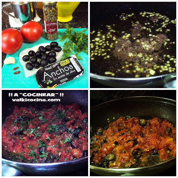 Vierte aceite en una sartén, añade el ajo y las guindillas y cuando empiece a dorar, .. las anchoas. Una vez que estas se deshagan, ( 1 minuto ), las aceitunas y las alcaparras.