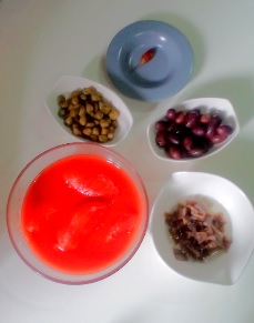 Por otro lado troceamos las anchoas, quitamos el hueso a la olivas negras y las troceamos también, añadimos las anchoas, las olivas y las tapenas a nuestra salsa y removemos.