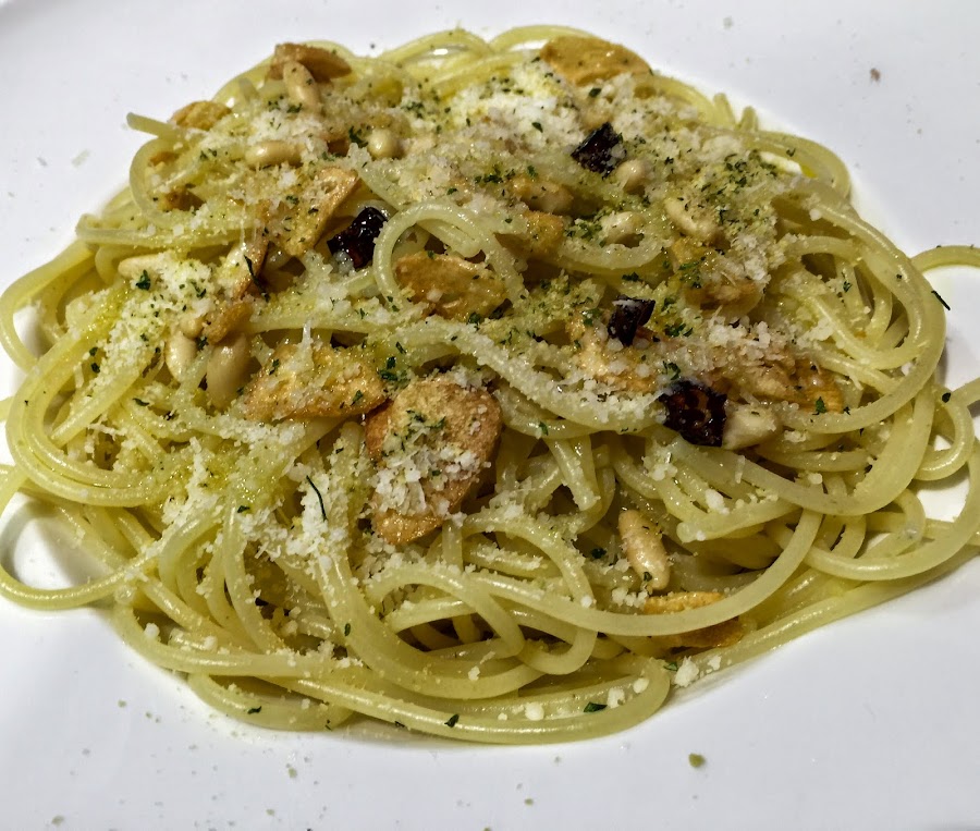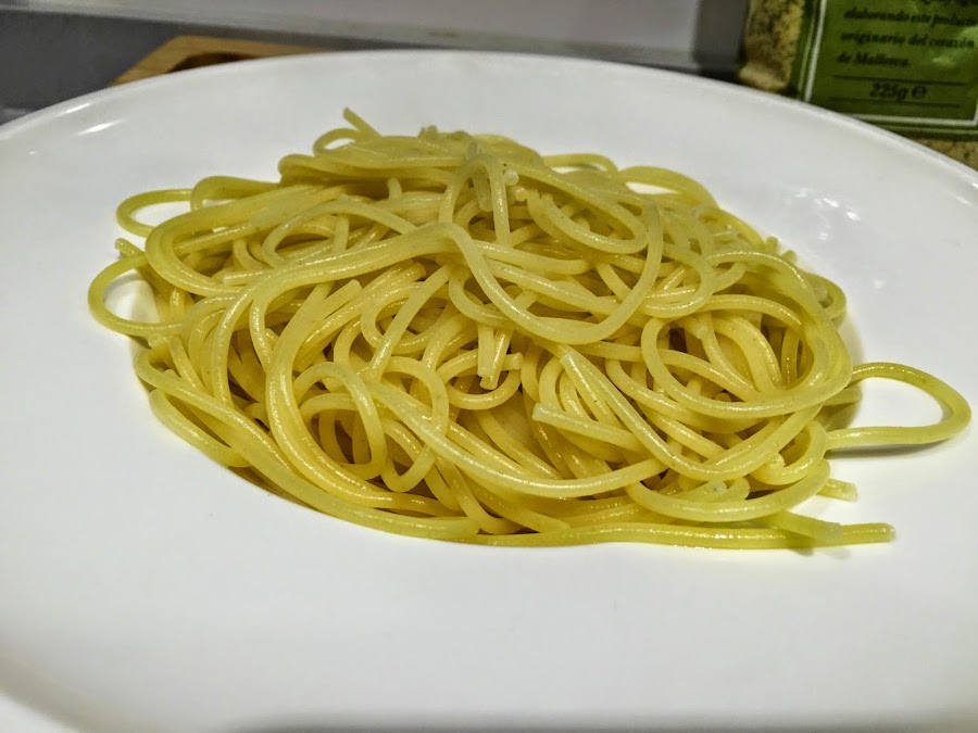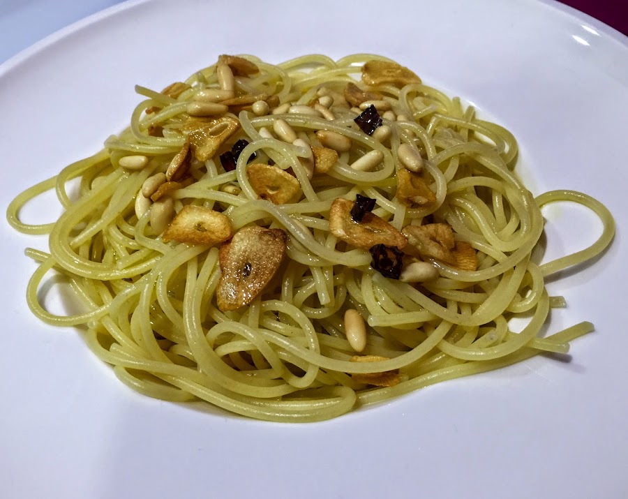 5. Pasados los 7 minutos escurrimos la pasta. Servimos en el plato los espaguetis. Añadimos el sofrito de ajos, piñones y guindilla por encima. Ponemos también un par de cucharadas de aceite de oliva a cada plato.