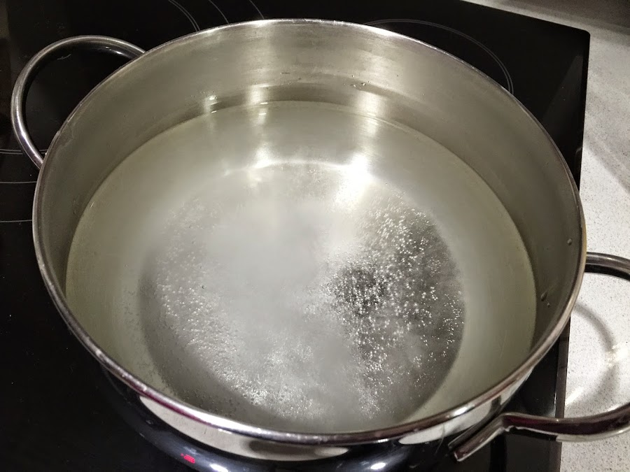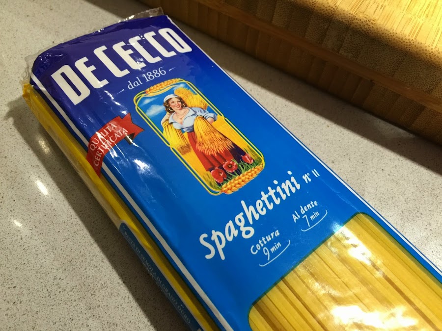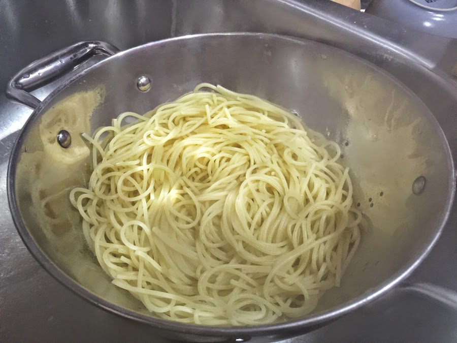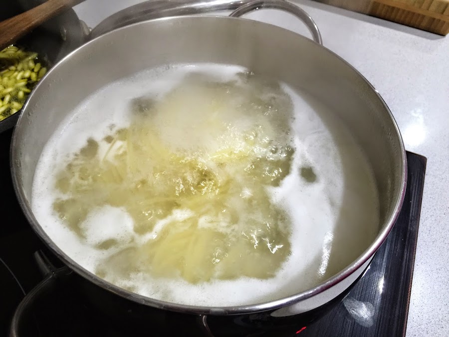 4. En una olla ponemos agua y sal. Ponemos el agua a calentar a velocidad máxima. Cuando hierva añadimos la pasta, yo me he decantado por unos espaguetis. Mirar las instrucciones del paquete para saber el tiempo adecuado de cocción. Para esta marca, con 7 minutos queda al dente, como nos gusta en casa.