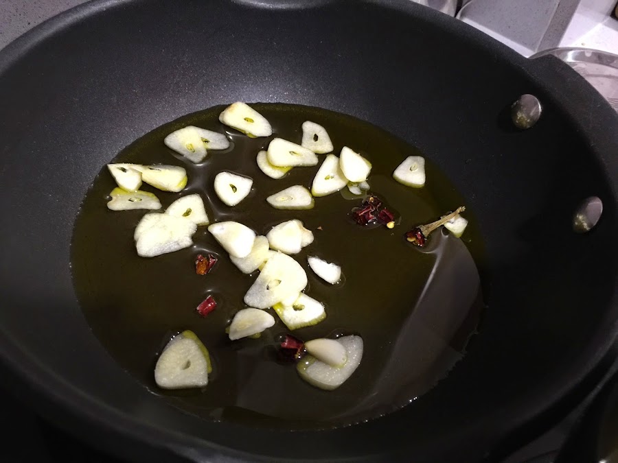 2. En una sartén ponemos el aceite de oliva virgen extra, que cubra bien la base de la sartén. Ponemos el fuego a temperatura media. Añadimos los ajos laminados y los trozos de guindilla. Freímos durante 2 o 3 minutos.