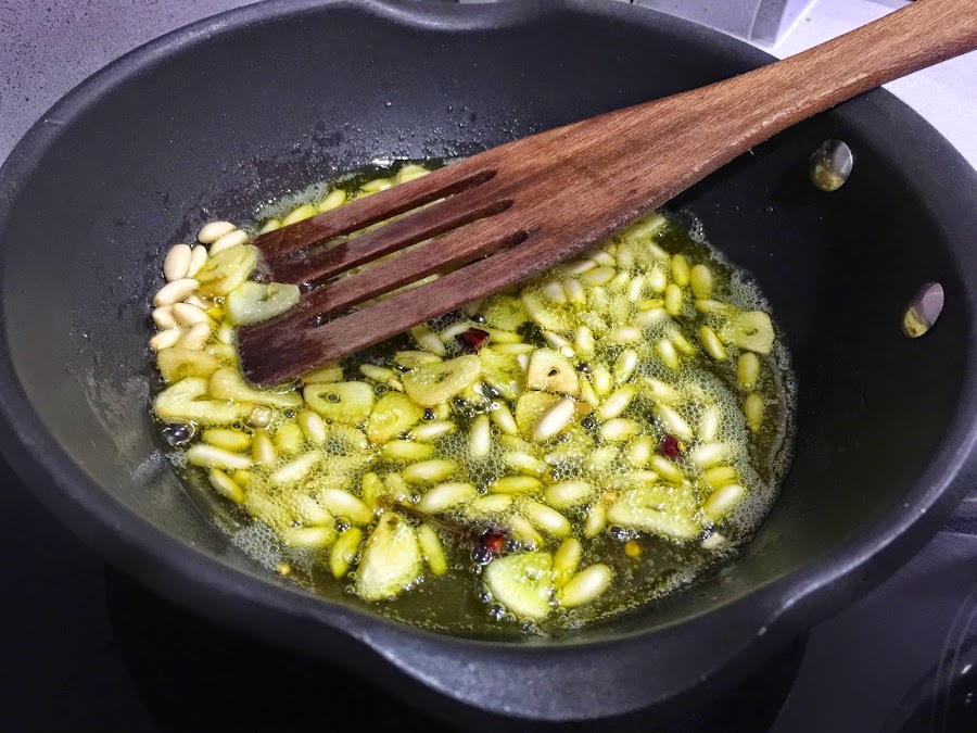 3. Añadimos los 50g de piñones extra del país, y a fuego medio freímos hasta que todo el conjunto tome un color doradito. Reservamos.
