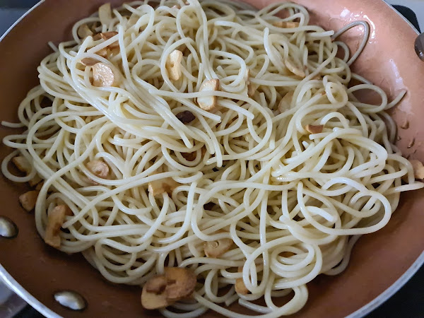 3. - Cuando estén los espaguetis, los escurrimos y , sin aclararlos con agua, los echamso sobre los ajos refritos. Removemos bien para que se impregnen bien con el aceite y se reparta el ajo, y servimos inmediatamente.