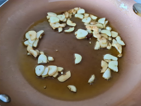 2. - Lo ponemos enuna sartén con un buen chorreón de aceote y lo dejamos a fuego medio, junto con la guindilla, hasta que el ajo coja color.