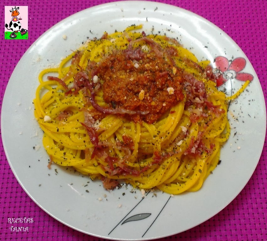 Servimos los espaguetis en un plato, añadimos la salsa de pesto rojo,ponemos los hilos de jamón curado,espolvoreamos queso parmesano, albahaca picada y listo para comer!!!! Exquisito...:D