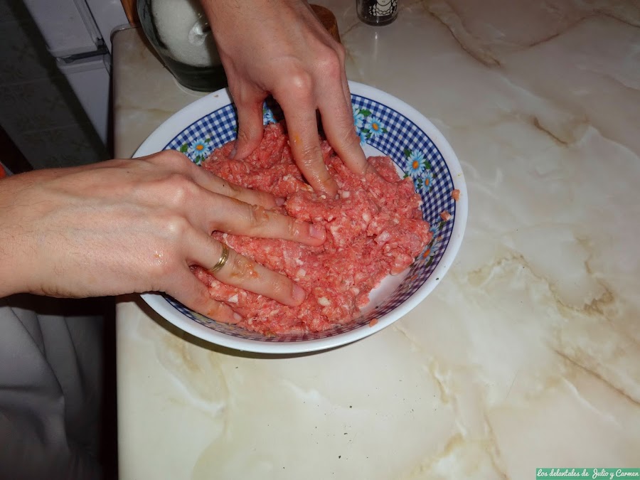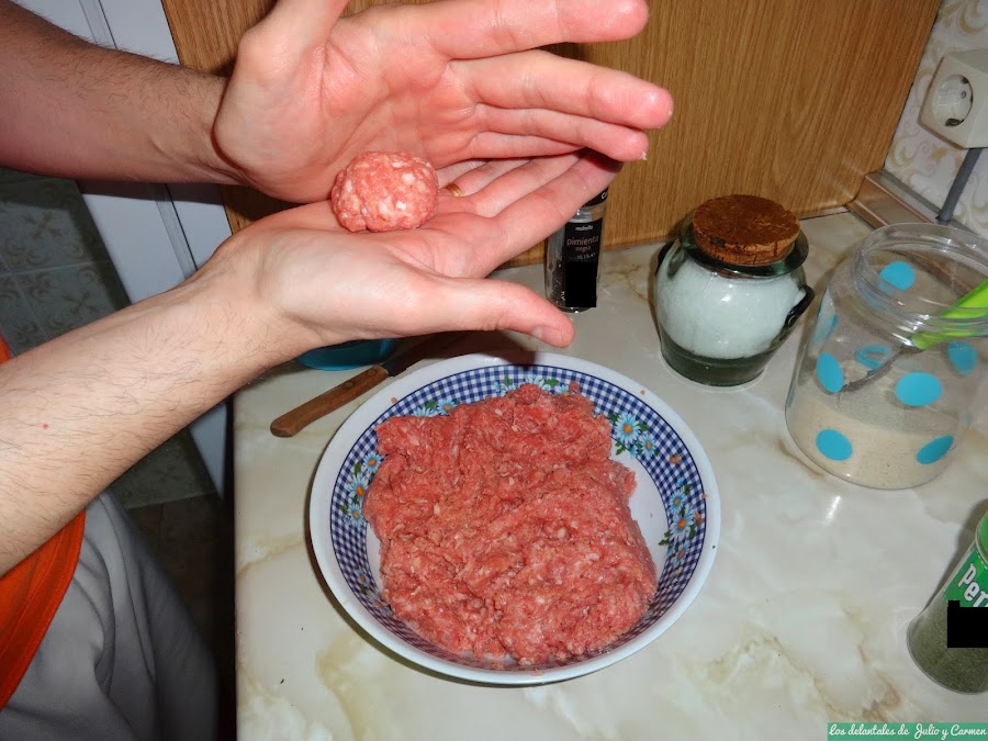Crearemos bolas con la carne (procurar que no sean muy grandes). Las pasaremos por harina y las freiremos en una sarten con un buen chorro de aceite.