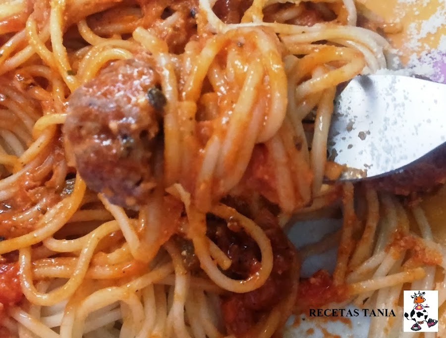 Ponemos agua en un caldero,un poquito de sal y un chorrito de aceite de oliva y cuando empiece el agua a hervir añadimos los espaguetis y los dejamos unos 12min o hasta que estén hechos. Hacemos las albóndigas, a la carne le ponemos sal, pimienta negra molida y dos ajos triturados,mezclamos todo bien, hacemos las bolas, freimos y reservamos. Aparte hacemos un sofrito,con la cebolla y los pimientos,luego añadimos las albondigas y el tomate frito,ponemos un poquito de orégano y tomillo. Escurrimos los espaguetis y emplatamos,ponemos los espaguetis en un plato y por encima la salsa con las albóndigas....está riquísimo!!!