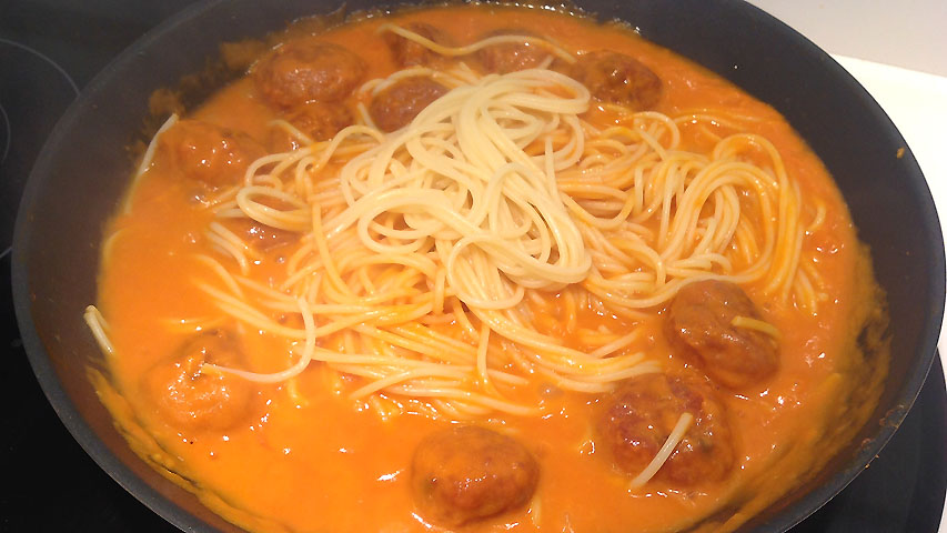 Solo falta mezclar la salsa con la pasta y las albóndigas.