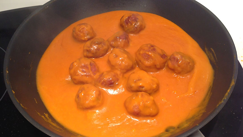 Introduce en esta salsa las albóndigas una vez fritas y mezcla todo bien.