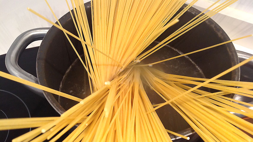 Cuece los espaguetis en agua con sal y añádelos a la salsa una vez cocidos.
