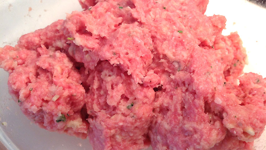 Pon en un bol carne picada (ternera-cerdo) un huevo, ajo, perejil, la miga de pan mojada en leche y salpimienta.