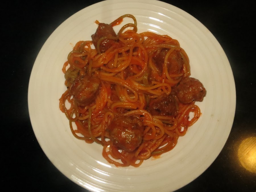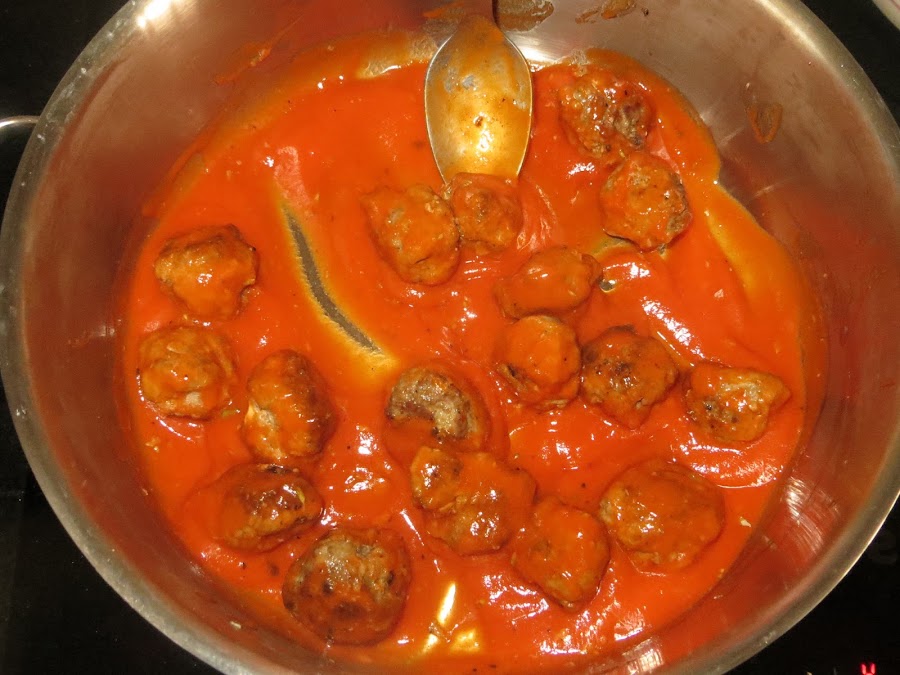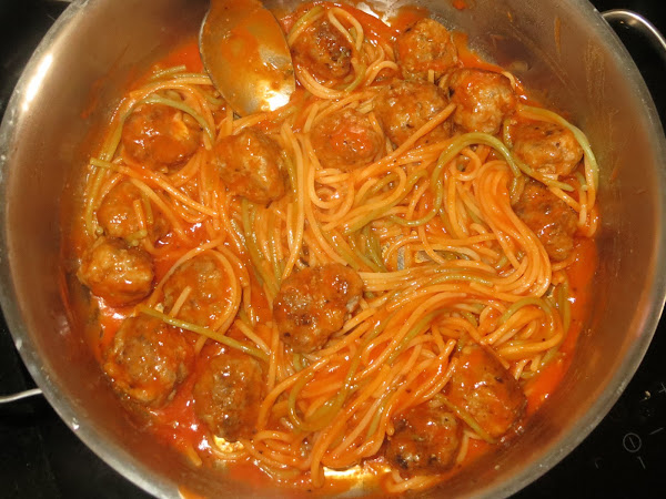 Ahora colocamos la salsa en una cazuela y le echamos las albóndigas para que la salsa vaya cogiendo gusto y ponemos a cocer la pasta en abundante agua con un poco de sal y una hoja de laurel. Una vez tenemos cocida la pasta, la escurrimos y la ponemos en la cazuela del tomate, si vemos que nos queda demasiado espesa la salsa, podemos añadirle un poco de agua. Damos varias vueltas para mezclar todos los ingredientes y ya está listo el plato para servir.