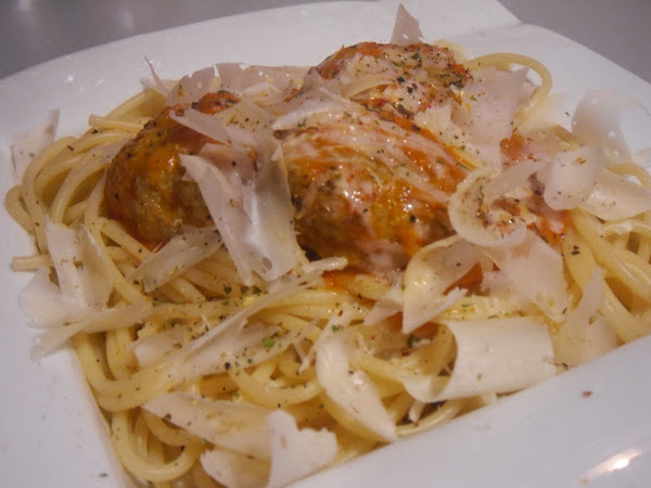 En un plato pondremos los espaguetis y encima echaremos las albóndigas con la salsa de tomate, adornamos con unas lascas de queso parmesano y ya habremos terminado nuestro delicioso plato.