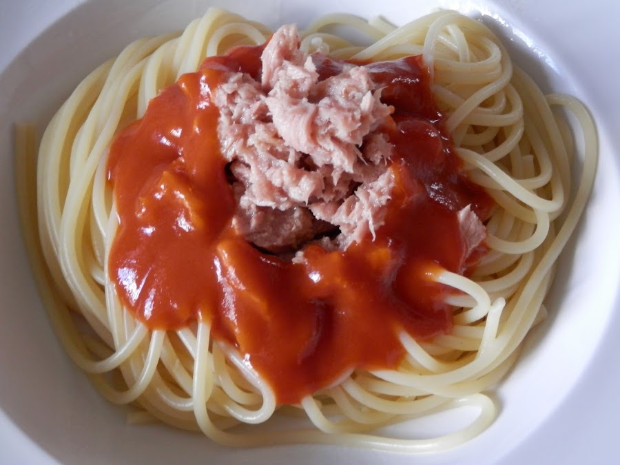 Dispondremos los espaguetis en el plato y añadiremos un chorro de tomate frito.
