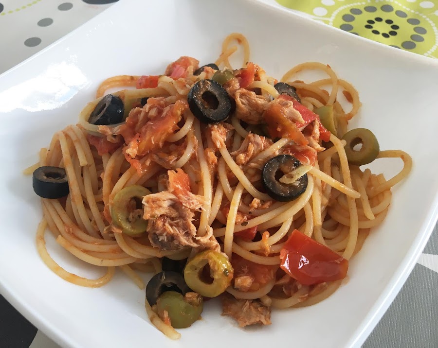 - Incorpora las aceitunas y el atún y rehoga un par de minutos más.