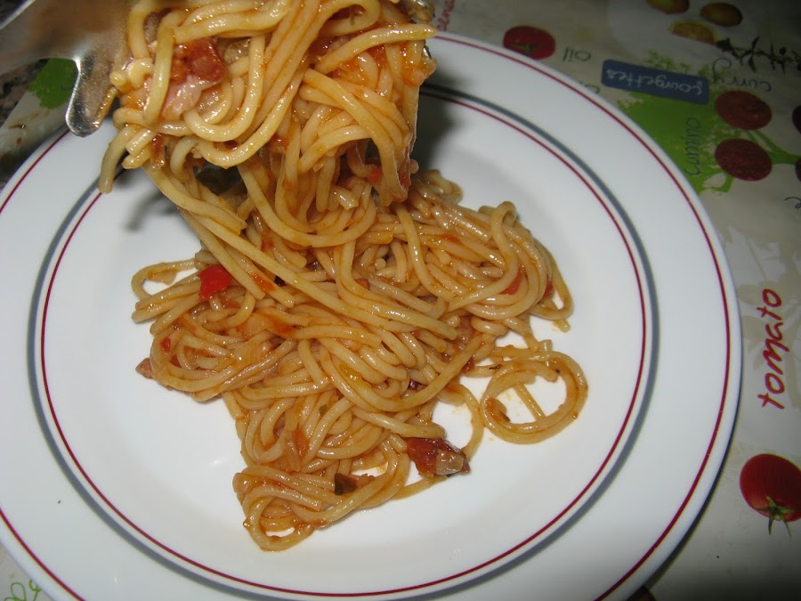 A continuación añadimos los espaguetis, yo los suelo partir a la mitad para que luego el agua los cubra mejor, ponemos el bote de tomate, la hoja de laurel y el orégano, revolvemos un poco para mezclar y añadimos el agua, como comenté antes utilizo el bote del tomate, suelo echar entre 2 y 3 tarros de agua, que cubra todo pero no pasarse, echamos el sal y programamos la olla.
