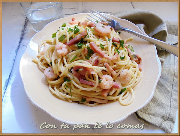 La receta de hoy lleva un poco de todo, un poco de pasta, un poco de bacon y un poco de gambitas. La combinación es riquísima y de sabor si que tiene mucho.