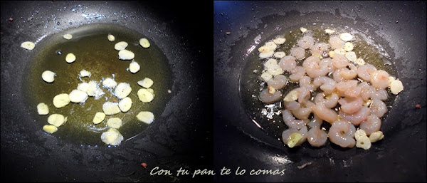 3. Retiramos las gambitas en cuanto cambien de color y las reservamos junto con el bacon.