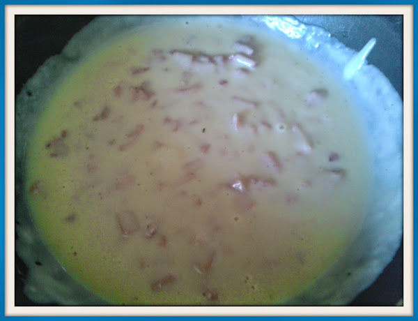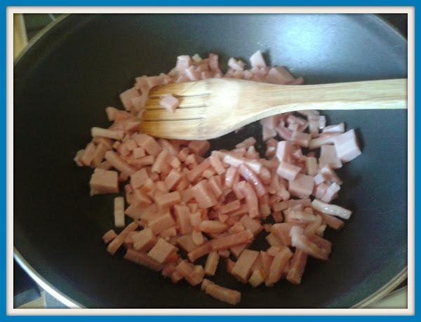 Cortamos el beicon y el jamón de pavo (si lo compramos por piezas) en dados y los doramos en una sartén (sin aceite porque el beicon ya suelta grasa), durante 2 o 3 minutos.
