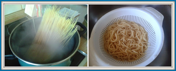 Hervimos los espaguetis en agua salada con una hoja de laurel, durante 8 minutos aproximadamente y los escurrimos.