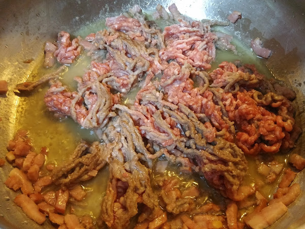 En una olla grande, vamos a freír el bacon y la carne picada con un chorrito de aceite.