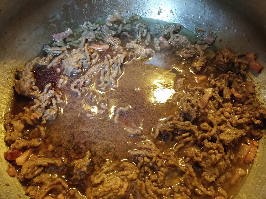 Cuando empiece a dorarse añadimos un vaso de vino tinto. Dejamos que se evapore a fuego lento.