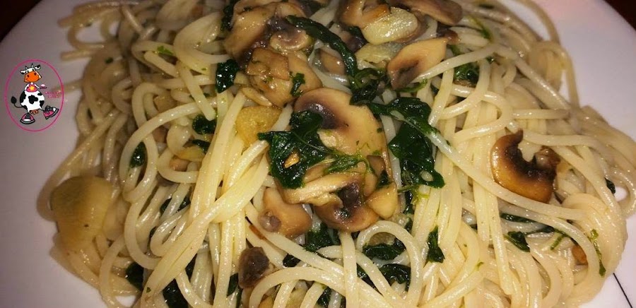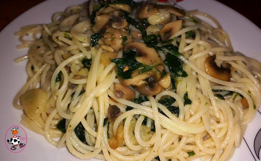 Ponemos un caldero al fuego con agua y un poquito de sal. Cuando empiece a hervir añadimos los espaguetis y dejamos que se hagan (12min mas o menos). Cuando estén cocidos reservamos. En una sarten ponemos un chorrito de aceite de oliva, sofreímos los ajos picados. Cuando empiecen a dorarse añadimos los champiñones bien lavados y cortados en lámina. Removemos bien añadimos un poquito de sal, un poquito de pimienta blanca molida y perejil picadito. Mezclamos bien y apagamos el fuego.