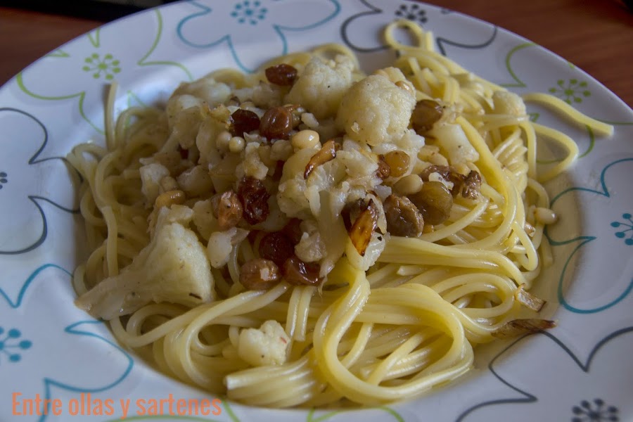 A continuación añadimos la coliflor y las pasas, salpimentamos y añadiéndole un poco de agua del remojo de las pasas dejamos cocer a fuego suave unos 10 minutos.