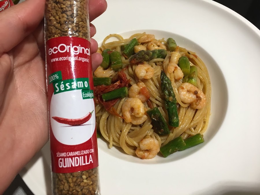 4. Emplatamos en un plato hondo y ponemos la cucharada de sésamo caramelizado con guindilla de Ecoriginal por encima de los espaguetis, también ponemos un hilito del aceite de sésamo.