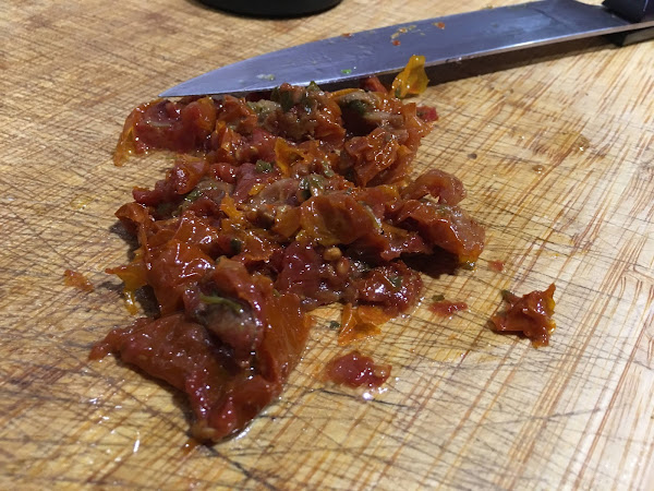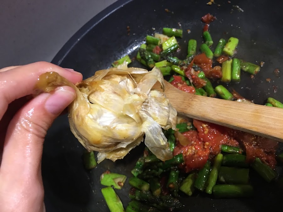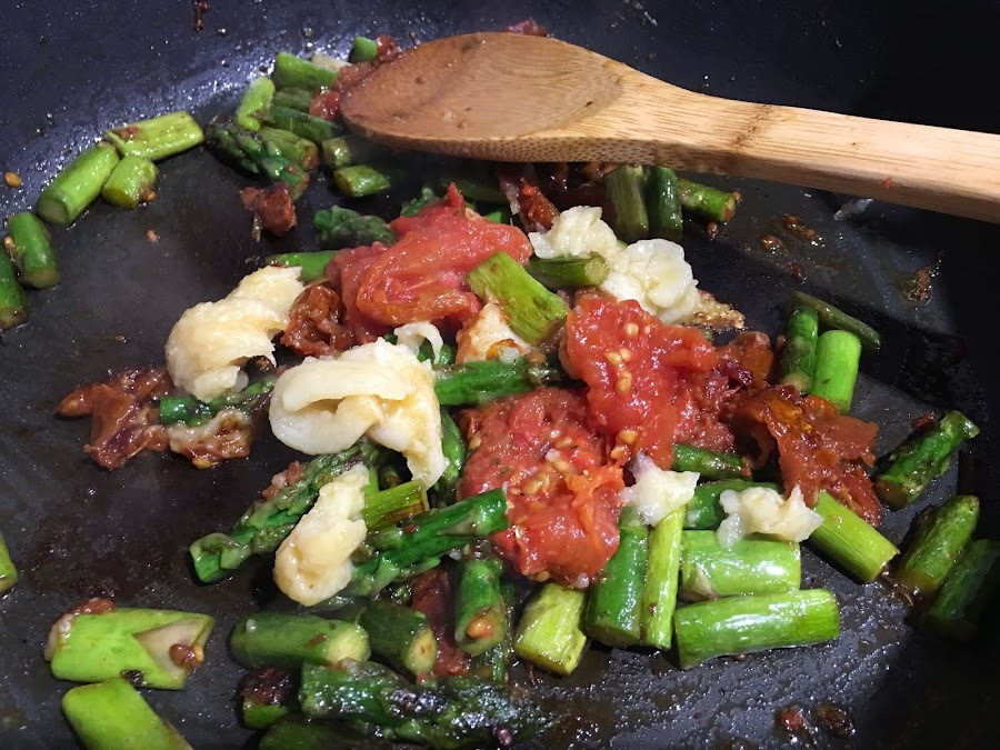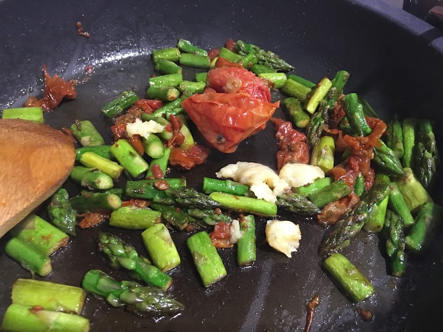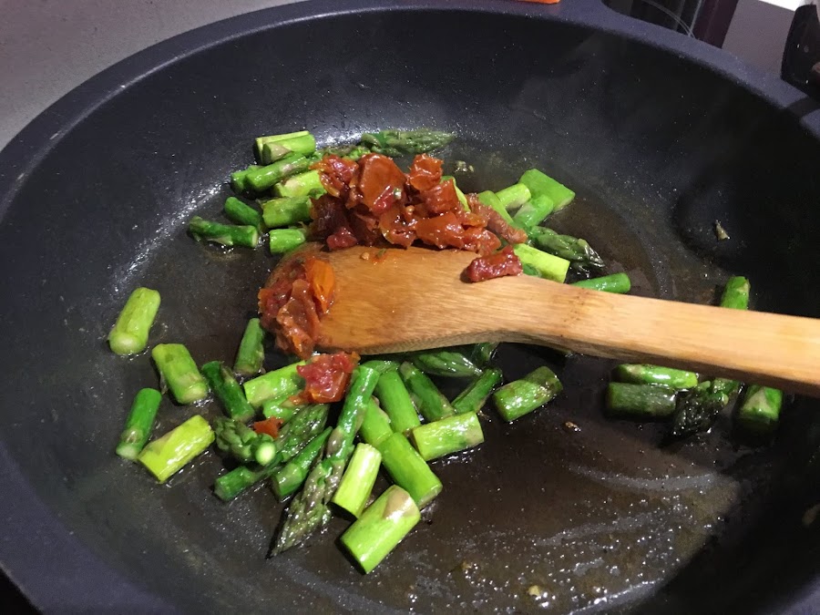 2. Cortamos a trocitos pequeños los tomates deshidratadas y los añadimos a los espárragos salteados. A continuación añadimos la cabeza de ajos rustida, y los tomates rustidos, con ello se consigue un plato lleno de sabor.