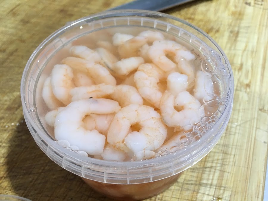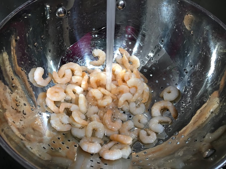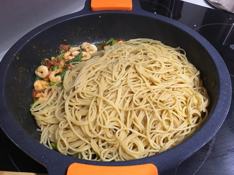 3. Lavamos las gambitas y las incorporamos a la cazuela, rehogamos un par de minutos. Incorporamos los espaguetis cocidos y los salteamos a fuego alto, para que absorban todo el sabor de la salsa.