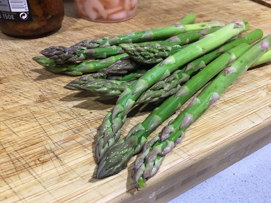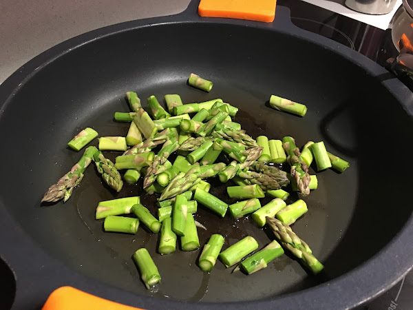 1. En una cazuela ponemos las 6 cucharas de aceite de sésamo a fuego alto. Lavamos y cortamos a trocitos pequeños los espárragos verdes y los rehogamos. Mientras salteamos los espárragos ponemos una olla con agua hirviendo y empezamos a cocer los espaguetis.