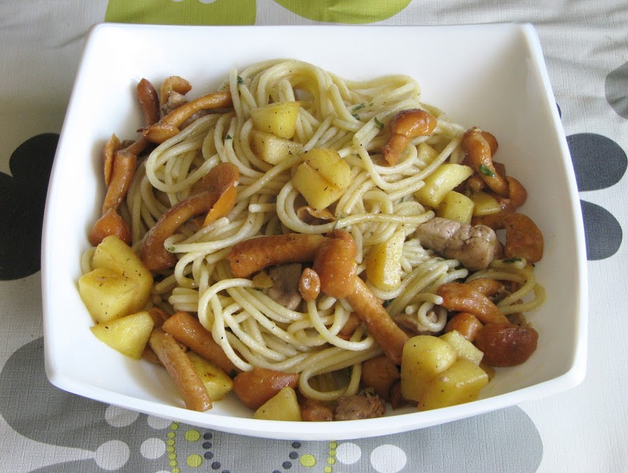 - Añade la manzana y las setas y rehógalo hasta que se dore.