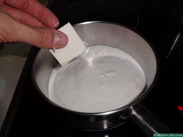 En un cazo, vertemos la nata (crema de leche) y los quesitos Kiri y los pondremos a fuego medio.